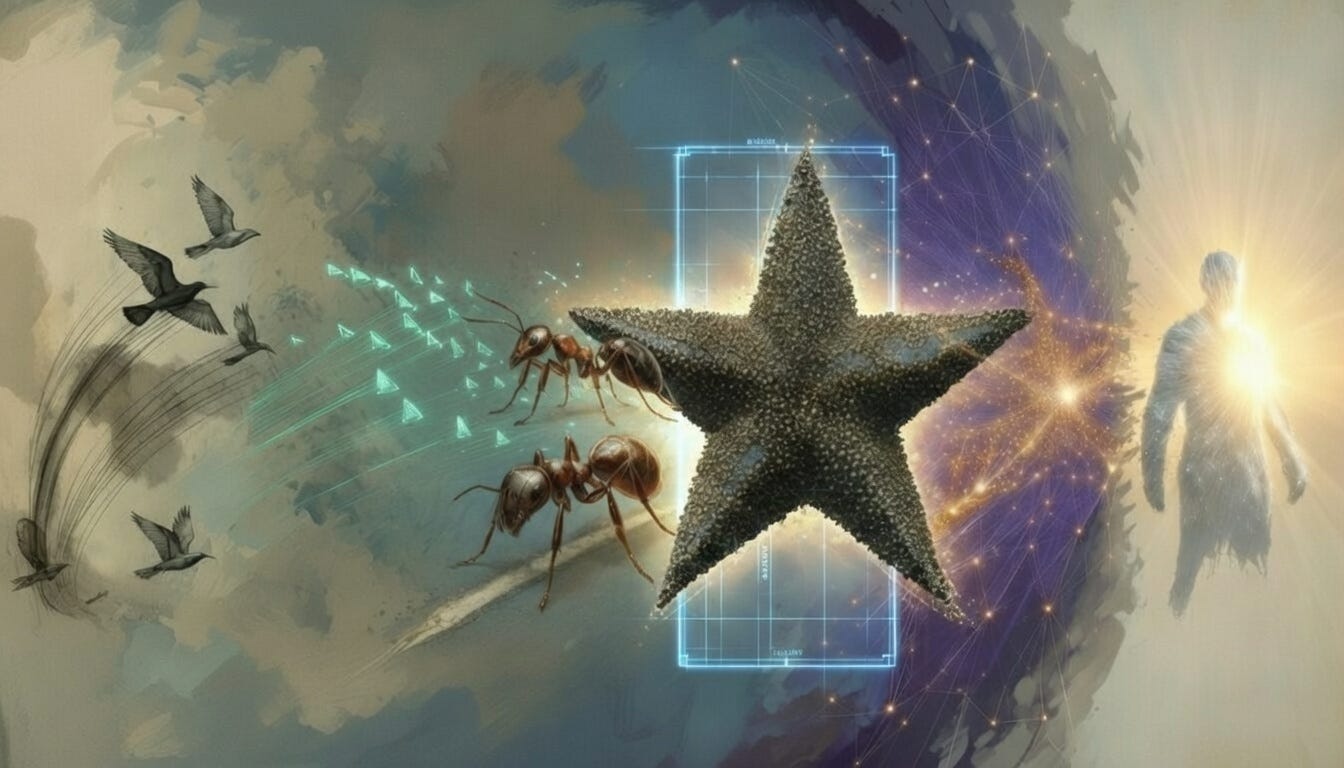 Twelve hours for a star. Imperfect, warped, assembled one robot at a time by machines that couldn’t move in a straight line or see more than a few centimeters. But assembled without a leader, without a blueprint, without any robot understanding what it was building. One thousand machines, each following the same simple program, each responding only to its immediate neighbors, each as blind to the final shape as a starling is blind to the murmuration.