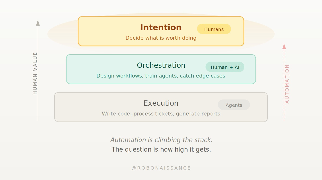 The result is a new economy with three layers. At the bottom, execution: agents write the code, process the tickets, generate the reports. In the middle, orchestration: humans design the workflows, train the agents, catch the edge cases. At the top, intention: someone decides what is worth doing in the first place. Automation is climbing the stack. The question is how high it gets.